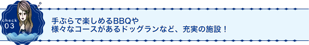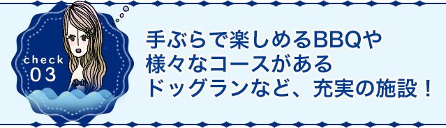 - 手ぶらで楽しめるBBQや様々なコースがあるドッグランなど、充実の施設!