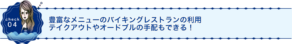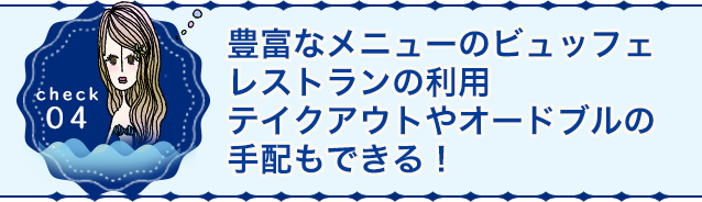 - 豊富なメニューのバイキングレストランの利用、テイクアウトやオードブルの手配ができる!