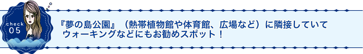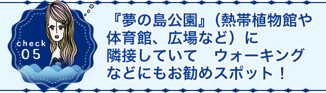 - 『夢の島公園』(熱帯植物館や体育館、広場など)に隣接してウォーキングにもお勧め!