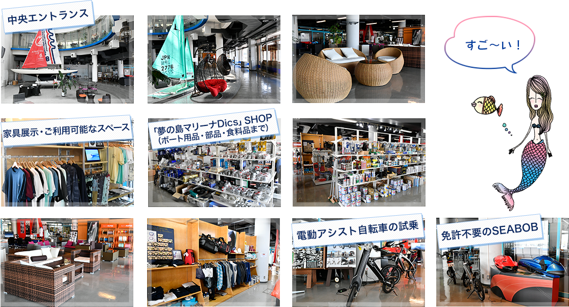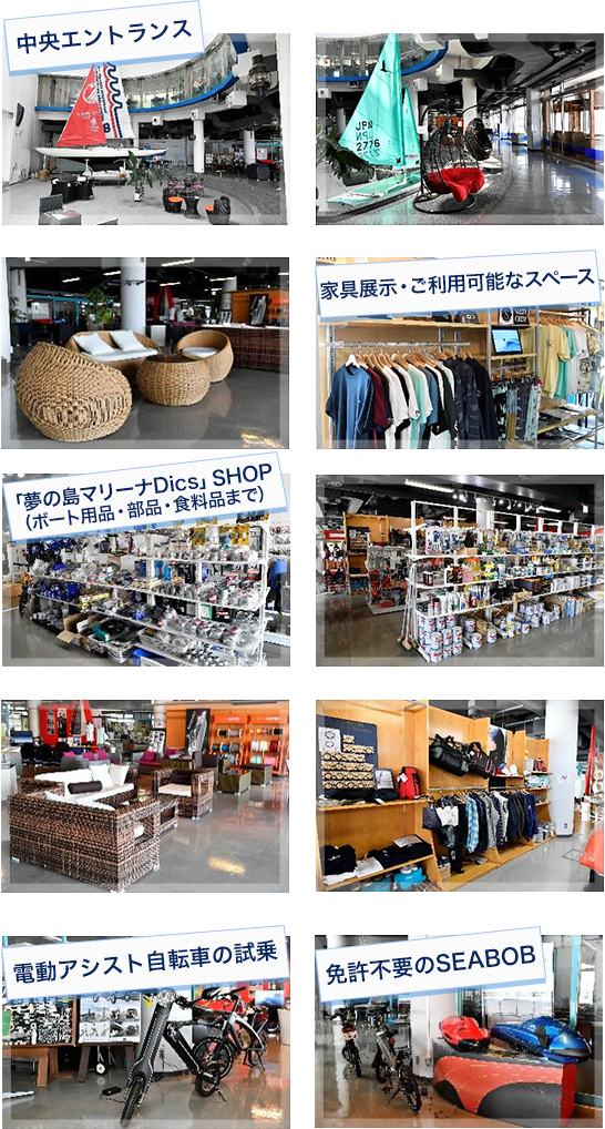 センター1階にはマリングッズ、ボートメンテナンス用品や部品などを取り揃えた「夢の島マリーナDics」のショップもある。