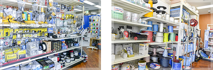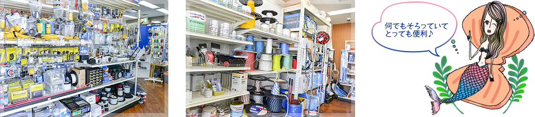 メンテナンス用の部品など豊富なマリングッズを取り揃えている。